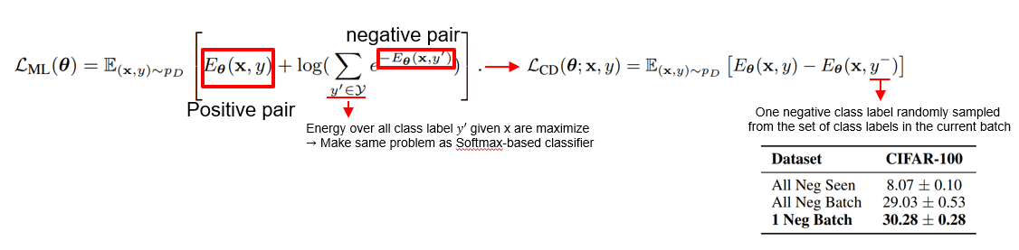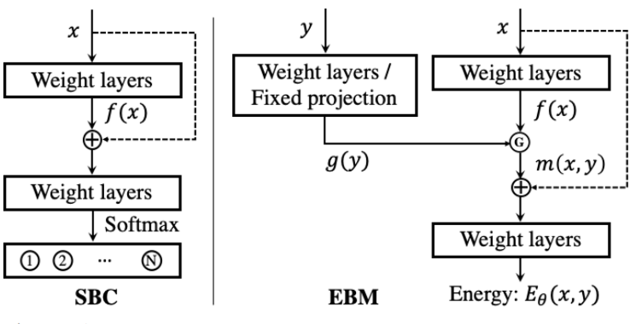 EBM classifier: y(판별하고 싶은 class들)과 x(입력)를 입력으로 받아 Energy-based classifier에 넣어서 가장 낮은 에너지 준위가 나오는 y가 해당 x의 클래스