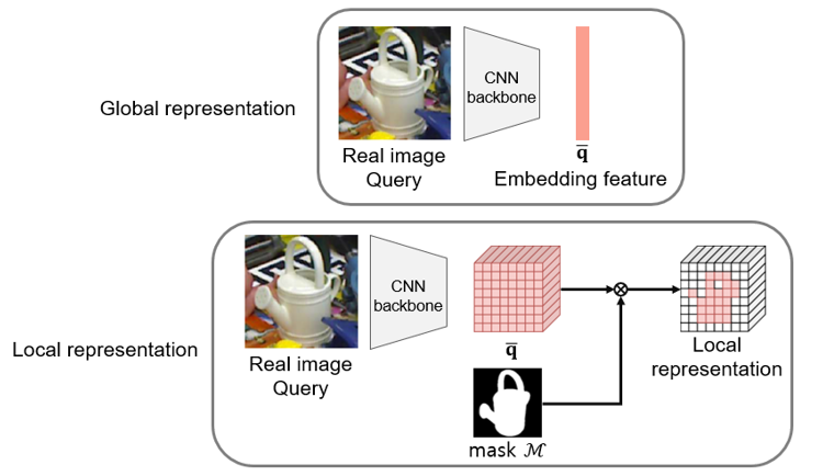 Local representation(Unseen object performance): masking global feature with binary template mask M to solve the problem of unseen object's cluttered backgrounds