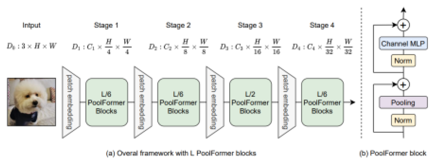 - PoolFormer: Prove that the structure of the MetaFormer has a greater impact on the performance of the transformer by replacing the token mixer with a pooling layer to validate performance.