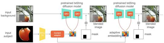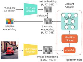 - Content adaptor for object identity: image-to-text embedding using CLIP embedding (to use a diffusion model designed for text embedding)