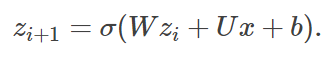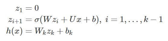 구체적으로 설명하면 i+1번째 layer의 latent vector는 i 번째 latent vector에 전 layer에서 공유하는 weight W를 거쳐 input tensor x에 보조적인 weight U를 거쳐서 나온 결과 (x의 선형변환)와 bias를 더해주고 activation function을 씌운 형태라고 할 수 있다. 놀랍게도 이런 형태의 neural network도 일반적인 neural network과 비교하여 상당히 잘 작동하는 것을 확인할 수 있다.