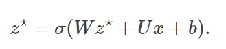 DEQ에서는 여기서 한가지 가정이 들어간다. 위의 weight-tied, input-injected layer를 무한정 반복한다고 생각해보자, i가 무한대로 된다고 할 때 일반적인 neural network에서는 latent vector가 fixed point 혹은 equilibrium point라고 할 수 있는 z*에 수렴할 것이라는 것이다.