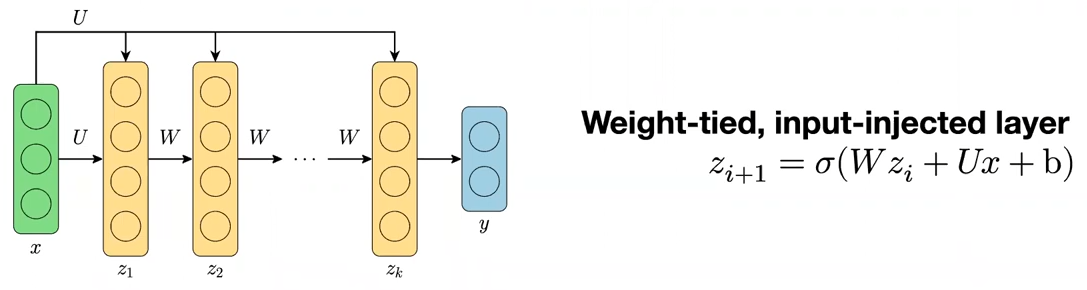 위의 일반적인 neural network를 넘어서 weight-tied, input-injected 형태의 layer를 가진 neural network를 생각해보자.