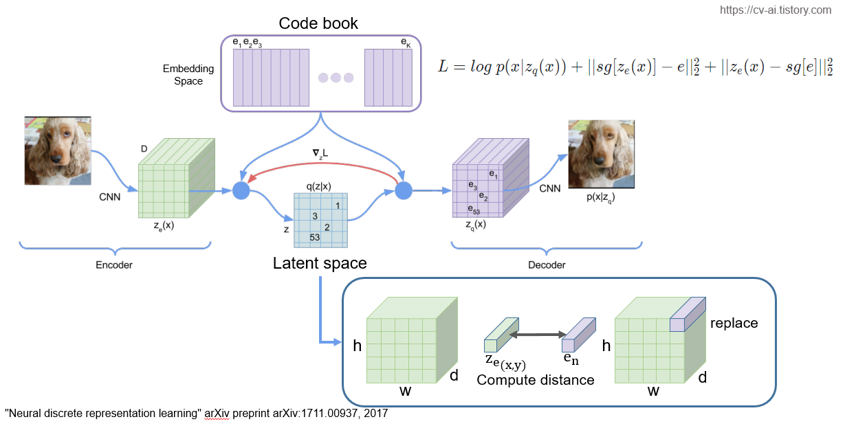 미리 사전에 정해놓은 K개 만큼의 learnable한 codebook vector로 encoder의 latent space를 대체하여 그 결과를 가지고 디코딩을 한다는 것이 차이입니다.