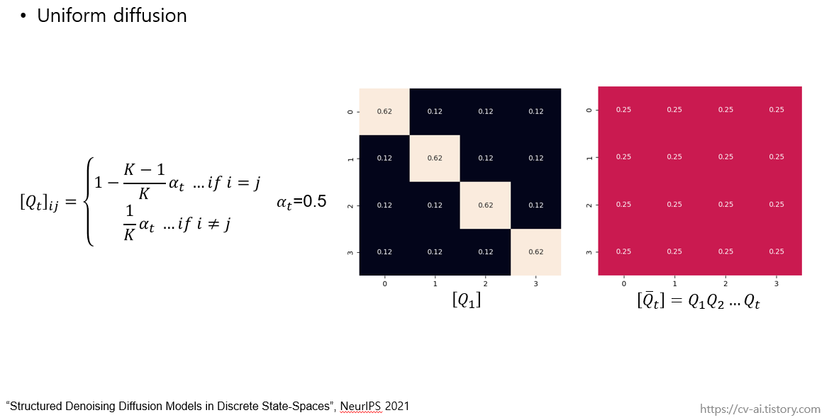 discrete diffusion에서 markov transition matrix도 Q_1부터 Q_t까지 곱하였을 때 우리가 알고 있는 stationary distribution에 수렴해야 합니다.