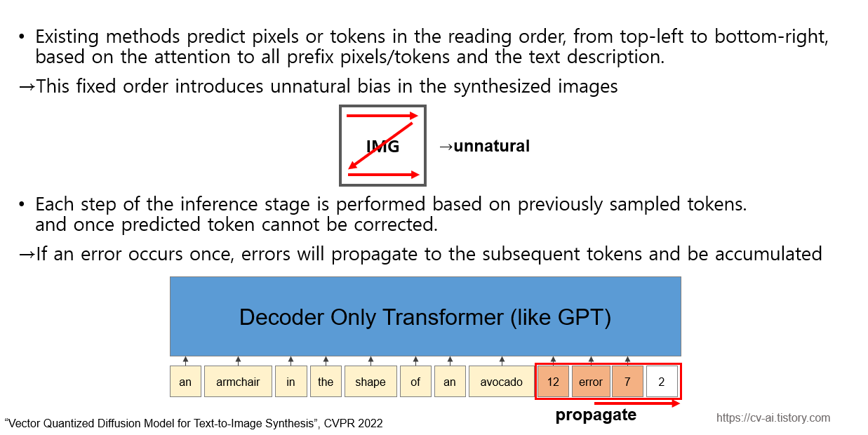-> 그런데 DALL-E와 같은 auto-regressive하게 latent space를 생성하는 경우 image generation task에서 image생성을 위한 code vector를 고르는 과정중에 좌상단에 해당하는 값들만 참고할 수 있다는 문제점과 한번 잘못 예측된 에러를 고칠 수 없어 계속 축적된다는 문제점이 있다.