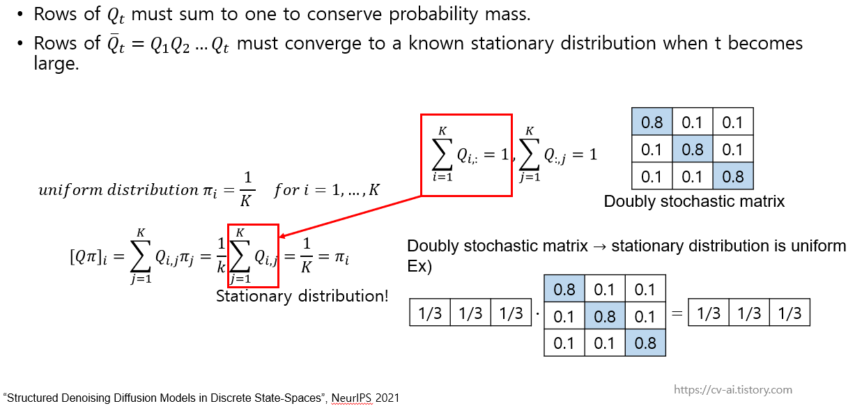 이 조건을 만족하는 matrix로는 uniform distribution을 갖는 row, column 합이 1인 doubly stochastic matrix가 있고 discrete diffusion process에선 이를 사용하게 됩니다.