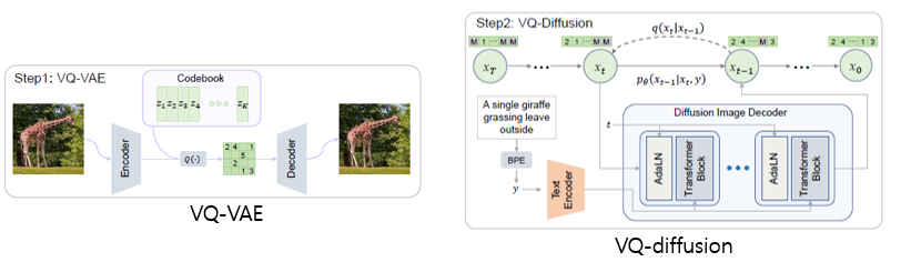 step1에서 학습된 codebook vector로 이루어진 latent space를 만드는 step2 VQ-diffusion part로 이루어져 있습니다.