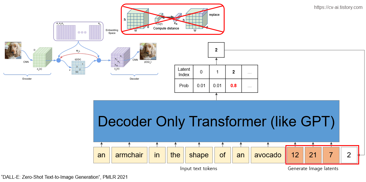 -> 하여 기존의 DALL-E와 같은 논문에서는 VQ-VAE와 같은 방식을 통해 latent space를 discrete한 codebook vector의 index로 표현함으로써 이를 해결하였다