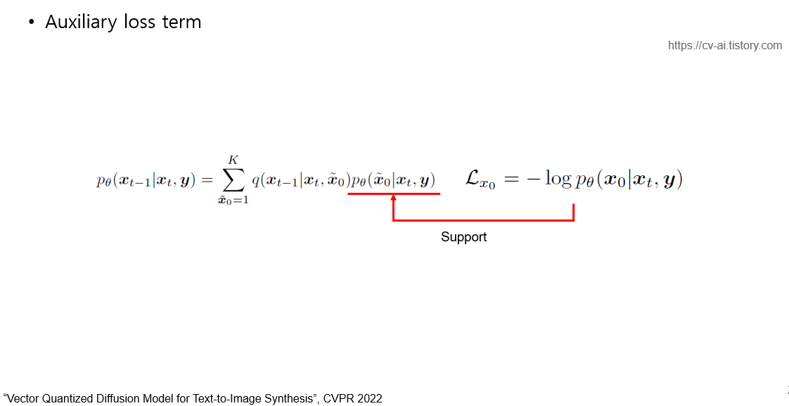 앞선 loss가 일반적인 diffusion model의 loss라면 해당 term은 3-2파트의 mask diffusion reverse process를 support하기 위한 loss term입니다. reverse process에서 x_t를 받아서 x_0를 예측하는걸 좀더 잘하게 해주기 위한 역할을 합니다.