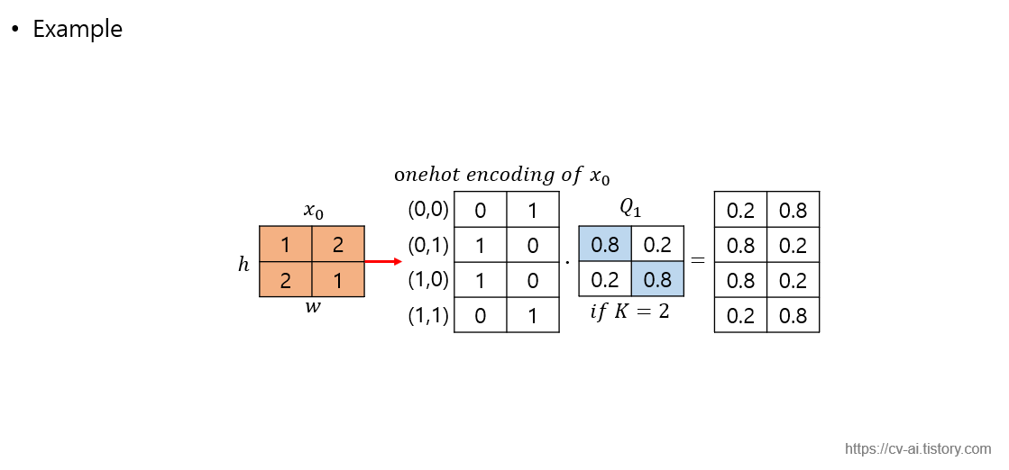 FIg7을 기준으로 1번 index(0~k-1 까지 인덱스 기준)의 codebook vector를 one hot encoding을 해주어 categorical하게 바꾼 뒤 markov transition matrix Q_t를 matrix multiplication 해주는 경우 0번 인덱스로 전이할 확률 0.1, 1번 인덱스로 전이할 확률 0.8, 2번 인덱스로 전이할 확률 0.1이라는 결과가 나오게 됩니다. 하단의 예를 통해 조금 더 자세히 설명하도록 하죠